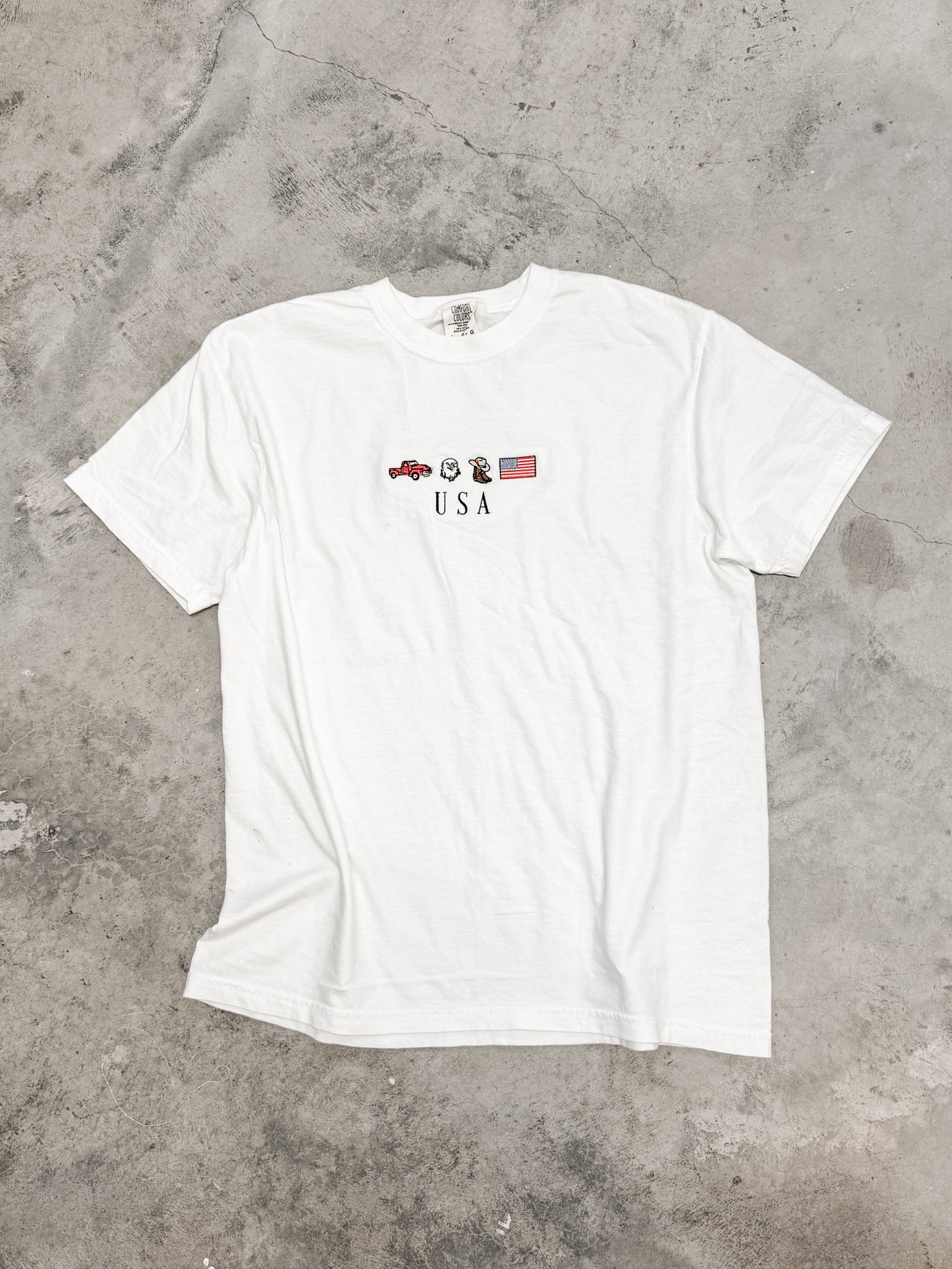 Celebrate American pride in style with this classic white Comfort Colors® t-shirt featuring four intricately embroidered icons that represent the heart of the USA. A vintage red truck, a pair of cowboy boots, a bold bald eagle, and the American flag head sit proudly across the chest, each stitched with detailed precision. Just beneath the icons, the bold “USA” lettering ties it all together with a clean, patriotic finish.